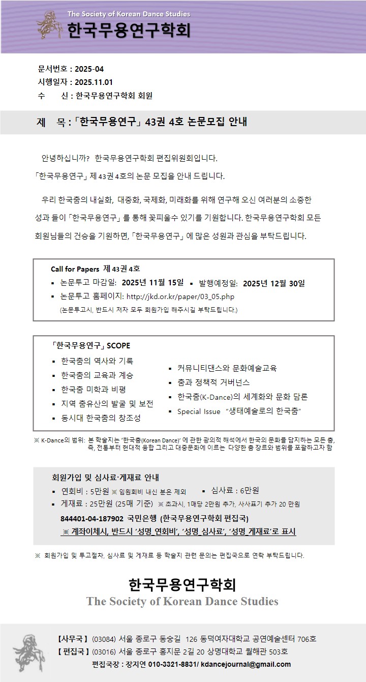 | 다음글 | 한국무용연구 43권 4호 투고 연장 안내 |